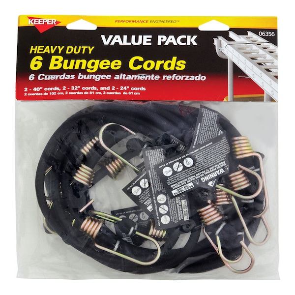 The Keeper Heavy Duty Bungee Cord is constructed from quality materials for long-lasting versatility and dependability. It features a durable outer jacket to withstand UV rays and weather damage. Inside, premium rubber ensures optimal performance and elasticity for repeated use. The dichromate steel hook at each end provides resistance against bending under pressure, perfect for indoor and outdoor use. It is available in a convenient 6 pack with multiple lengths to secure multiple items or can be used in tandem to keep larger items safe, secured and in place.