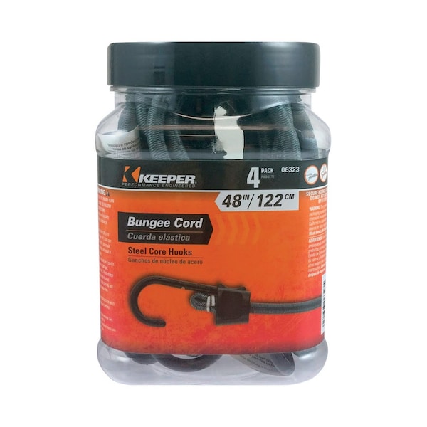The Keeper 48 in. SST Bungee Cord is designed with a durable outer jacket to withstand UV rays and weather damage. Inside premium rubber ensures optimal performance and elasticity for repeated use. At each end is a polypropene sheathed steel hook to prevent rust, scratching and marring to personal items. The bungee cord comes in a convenient 4-pack to secure multiple items or can be used in tandem to keep larger item in place.