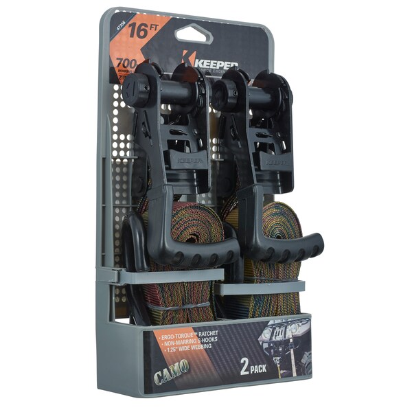 KEEPERĀ® 16' Ergo-TorqueTM Tie-Down is durable and reliable, ensuring easy access and control while tightening and securing any cargo. It features a molded grip, oversized lever to give precision control and a woodland camo webbing and black finish. With a working load limit of 700 lbs. and 2,100 lbs. break strength, the tie-down delivers outstanding strength and performance.
