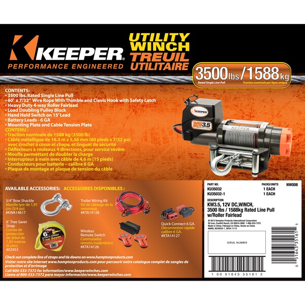 The KU3.5 is a High Performance, Fully Loaded Utility Winch Ideal for Car and Utility Trailers, and Recovery Anywhere a Flat Strong Surface is Available for Mounting. 1.2 HP Permanent Magnet 12V DC Motor, Automatic Full Load Holding Brake, 60’L x 7/32”Dia. Galvanized Wire Rope With Clevis Hook and Safety Latch, Galvanized Wire Rope Retaining Spring, Cam Activated Free-Spool Clutch, 3 Stage Full Metal Planetary Gear Train, Case Hardened Gears, Heavy-Duty Mounting Plate and Roller Fairlead, Integrated Heavy Duty Sealed Solenoid Switching, Hand Held Pendant Switch on 15’ Lead with Integrated LED High Density Work Light. 12,000lb. Pulley Block,Power In / Power Out. 3,500 lbs. of Pulling Power (Single Line Rated).