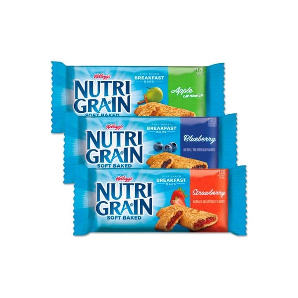 Kellogg's nutri-grain cereal bars, asstd: apple, blueberry, strawberry, 1.3 oz., 48/ctn combine deliciousness with calcium, with yummy calcium-enriched fruit snack bars. Soft and delicious bars provide the perfect sweet complement to your day. Convenient, individually wrapped bars are great for pockets and pursesperfect on the go. Assorted flavorsa yummy assortment of apple, blueberry, and strawberry bars make it easy to pick your favorite flavor. this product arrives to most customers in 2-3 business days.