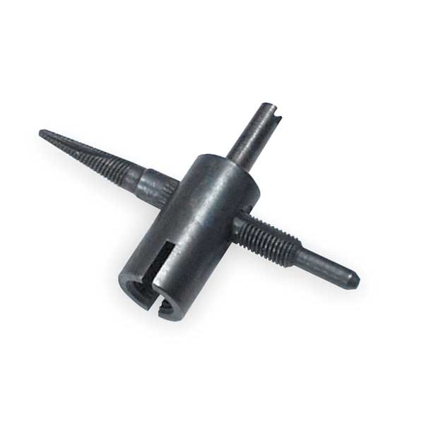 4 Way Professional Valve Core Tool, Product Type 4-Way Valve Tool, Material Steel, Overall Length 6 1/2 in, Overall Width 2 1/2 in, Overall Height 1 1/4 in, Overall Diameter Not Applicable, Color Black, Features A Screwdriver for Removing Standard Cores, Easy-Out Feature for Removing Damaged Cores, Handy 4-In-1 Standard Valve Tool Repairs Cap Threads and Repairs Core Threads