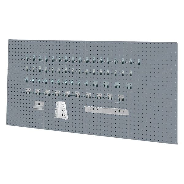 Pegboard Panel Kit, Peg Hole Shape Square, Peg Hole Size 3/8 in, Peg Hole Spacing 1 1/2 in, Panel Pegboard Type, 120 lb Panel Load Capacity, 20 ga Panel Thickness, Overall Depth 1/2 in, Overall Height 36 in, Overall Width 18 in, Storage Area 18 sq ft, Number of Usable Sides 1, Number of Hooks 0, Number of Panels 4, 480 lb Whole Unit Load Capacity, Gray, Powder Coated, Steel