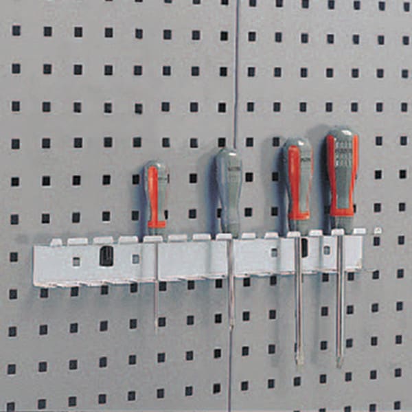Screwdriver Holder, Number of Hooks 1, Overall Height 1 1/2 in, Overall Length 3/4 in, Overall Width 17 3/4 in, 3/4 in Hook Depth, 1 1/2 in For Pegboard Hole Spacing, For Pegboard Hole Size 3/8 in, For Tool Type Screwdrivers, Surface, Locking Clip Locking System, Circle For Pegboard Hole Shape, Steel, Gray, Powder Coated, Toolholder Accessory Type, Screwdriver Rack