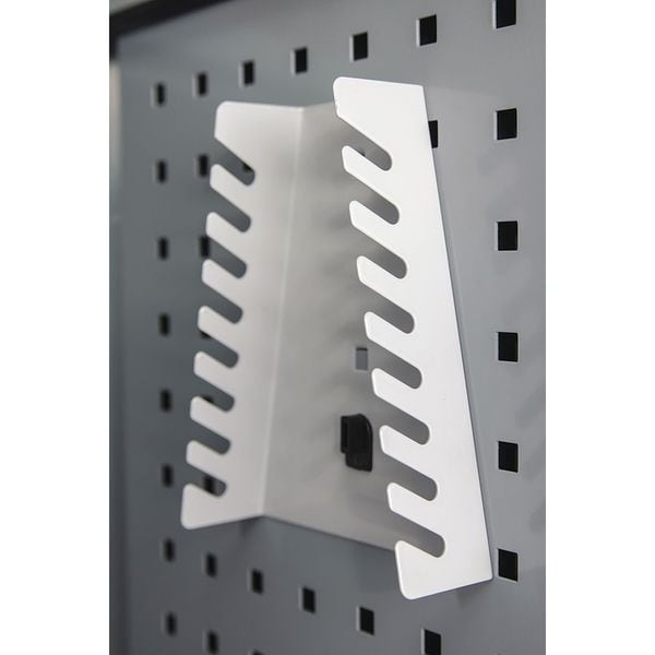 Wrench Set Holder, Number of Hooks 1, Overall Height 1 3/4 in, Overall Length 7 in, Overall Width 5 1/2 in, 7 in Hook Depth, 1 1/2 in For Pegboard Hole Spacing, For Pegboard Hole Size 3/8 in, For Tool Type Wrenches, Surface, Locking Clip Locking System, Square For Pegboard Hole Shape, Steel, Gray, Powder Coated, Toolholder Accessory Type