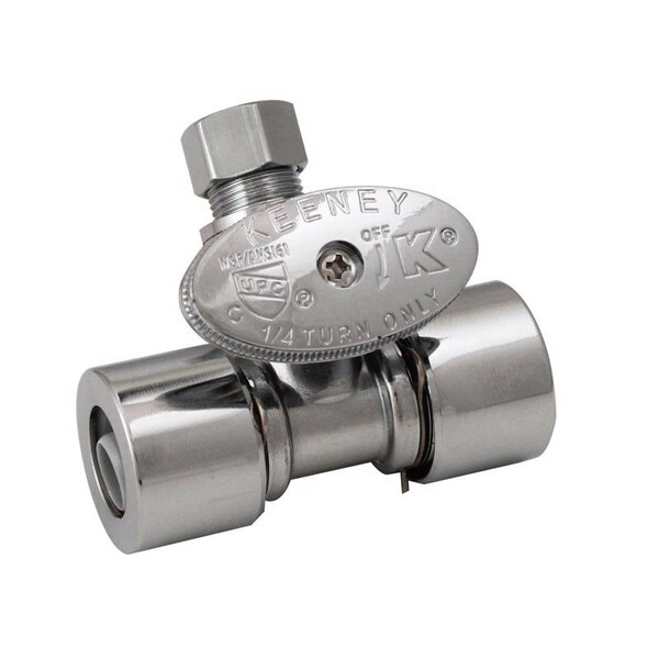 Solid brass chrome plated quick lock quarter turn in-line valve push fit application. A simple push-fit application connects to copper, CPVC, or PEX.