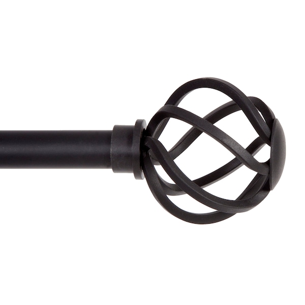 The 5/8 inch diameter Cage curtain rod in black features matching openwork cage finial ends. Use in your kitchen, bedroom, dining room, and living room to hang light to medium weight curtains. The telescoping rod adjusts from 28 inches to 48 inches to fit your window and projects 3 inches from the wall. It is ideal for hanging curtains with pockets, grommets, back tabs, and tab tops, but can also be used with clip rings.