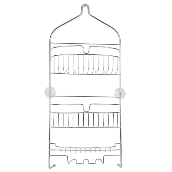 Organize your bath and maximize your storage with the Kenney 3-Tier Hanging Shower Caddy. The chrome finish and soft curves bring a more modern, yet functional, style to this classic bathroom storage solution. This steel shower caddy is rust-resistant and allows you to store all of your shower essentials in one place. This caddy features two shelves, four razor hooks, two loofah hooks, and one soap dish. The deep baskets allow for varying size bottles. The wire soap bar shelf allows excess water to drain and air to circulate, drying the bar of soap. The two hooks are great for hanging loofahs, washcloths, or other items like a waterproof speaker. The caddy comes with a rubber collar and suction cups to help keep it in place. The collar also prevents scratches to your showerhead, and the suction cups reduce the need to balance items. This caddy measures 24in H x 11in W x 4.5in D and can be hung from showerheads with necks up to 0.75in in diameter.