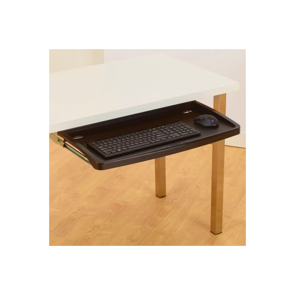Kensington 60004 under desk comfort keyboard drawer with smartfit system, black underdesk keyboard drawer features an extra wide 26" tray with integrated mousing area and is designed for use with standard workstations. Smartfit system lets you quickly and easily mount at one of three heights for customized comfort. Drawer includes wrist rest and mouse pad. Underdesk drawer offers easy installation and cable management. Mousing surface can be used to the left or right of the keyboard. Track length is 17".