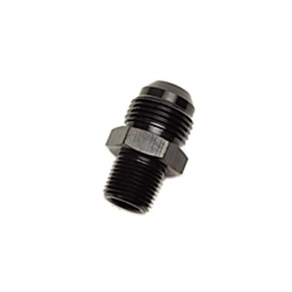 An to npt adapter fittings are the third and final step to completing your hose assembly. The an side of the fittings uses a 37 degree sealing angle that a positive seal at maximum operating pressures. These fittings are provided in straight 45 degree and 90 degree styles. Features -Automotive adapter fitting -10 an to 0.37 in. npt hose Specifications - Color: Black - Material: Aluminum - Type: Adapter