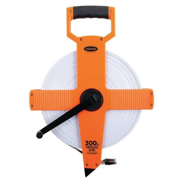 Engineers Long Tape Measure, Features Double Throat Rollers, Hook End, Case Material ABS Plastic, System of Measurement SAE/Engineers Scale, Graduation Marks 1/100 ft, Tip Style Nonmagnetic Single Hook, Zero Point Location Hook End, Blade Length - Metric Not Applicable, Blade Length - SAE 300 ft, Blade Material Fiberglass, Blade Width 1/2 in, Blade Return Type Manual, Blade Type Single-Sided, Case Color High-Visibility Orange, Case Length 12 in, Lock Type Nonlocking, Graduation Units Feet