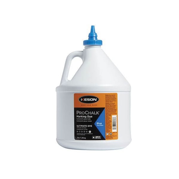 Keson ProChalk 103BD permanent weatherproof ultimate marking dye blue, 3 lb ultimate marking dye, permanent weatherproof, blue, 3 lb capacity, odorless odor/scent, ultra marine Blue. Prochalk ultimate dye which is almost 100% pigment for lines that are intended will be laid down once. Exterior applications include concrete layout, exterior layout, extreme conditions, long term applications.