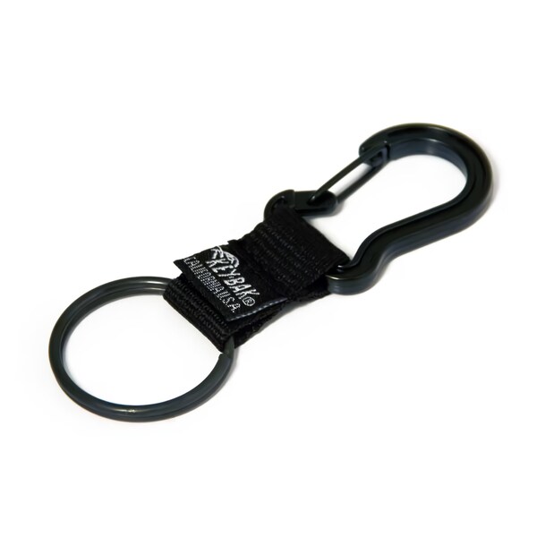 Black zinc alloy carabiner with ballistic nylon strap. 1-1/4 in. 3.2 cm black steel split-ring end. 4-1/2 in. 11.4 cm in Length . Attaches easily to belt loops, purse straps, backpacks and baby bags. 5 per pack