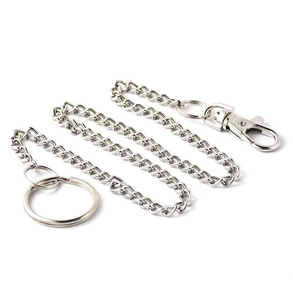 19 in. nickel-finish, link chain. Can hold keys or attach wallet for security. Nickellated tempered-steel split ring. Trigger clip attachment. Trigger secures chain onto belt loop, purse strap, tote, etc