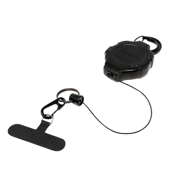 The KEY-BAK RATCH-IT Cell Phone Tether is the perfect way to keep your phone secure while you're on the go. The strong 36in cord made with DuPont Kevlar extends and retracts, ensuring your cell phone is always in reach and never lost.The ratcheting mechanism locks out in 6in increments allowing freedom of movement while staying tethered. The KEY-BAK RATCH-IT Cell Phone Tether is perfect for traveling, hiking, or any other activity where you need to keep your phone secure. It's also a great way to keep your phone from getting lost or stolen in a crowded area and a great tool to keep your phone from falling out of pockets, between car seets and airplane seats. The black split ring comes with an attached black mini carabiner clip that attached to an included phone anchor that slides between a cell phone and a cell phone case. This model is Black with a Carabiner top for attachment to bags, backpacks and beltloops.