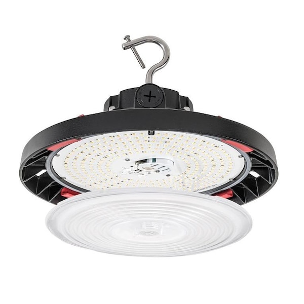200W Power & Color Selectable Round Highbay with Optic Swap |200W/150W/100W | Includes (2) lens types, Standard 90 deg and Wide Angle 120 deg |14-inch diameter |277-480V | 3000K/4000K/5000K | 0-10V Dimming | Built-in sensor receptacle | Standard black hou