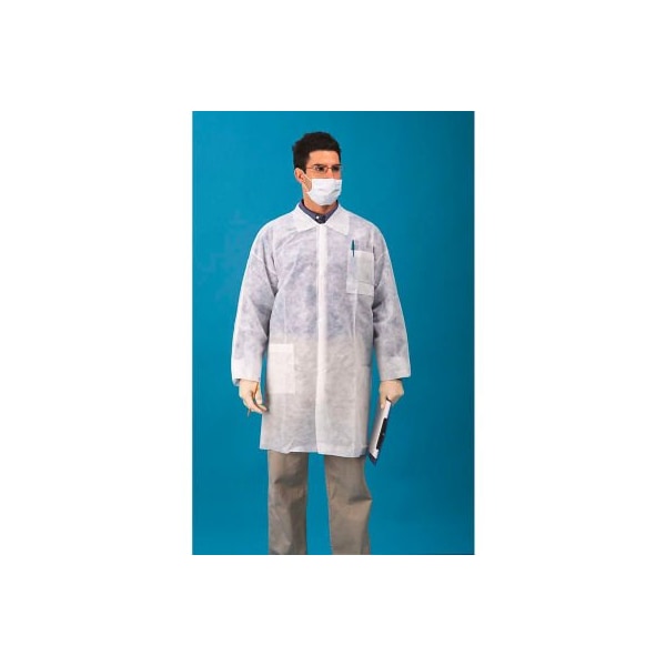 polypropylene lab coat with 3 pockets and open wrists, that is a light weight breathable fabric that provides economical protection. It is the best low cost solution to protect workers against dry particulates, dirt and grime.