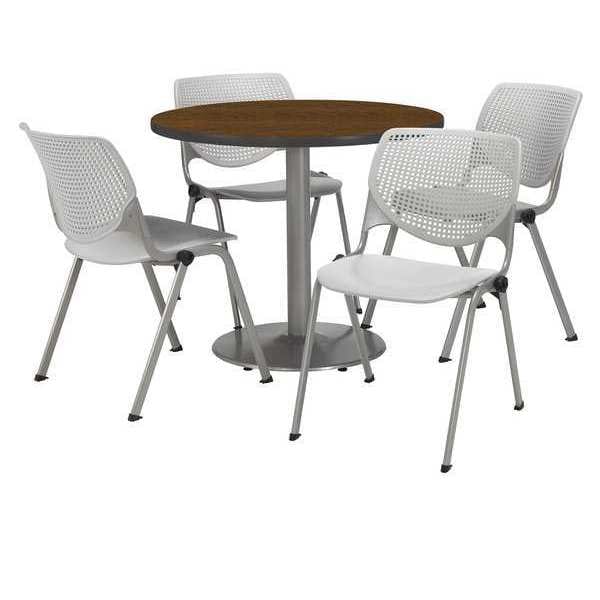 KFI Round 36" Dia. Pedestal Table with 4 Light Grey KOOL Series Stack Chairs, Walnut Laminate Top