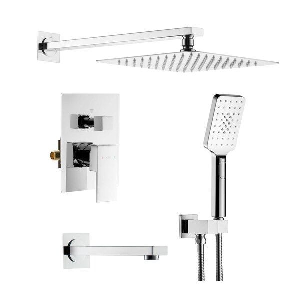 Elevate your shower experience extraordinarily with this Kibi Cube 3 function Shower System. This shower system is not only sleek in simplicity but also practical in function, which includes 10 in. thin profile brass rain shower, 3 function premium ABS hand shower, 60 in. stainless steel extended hose, brass tub spout, solid brass construction, branded pressure balance valve as well as all necessary escutcheon plate and installation hardware.