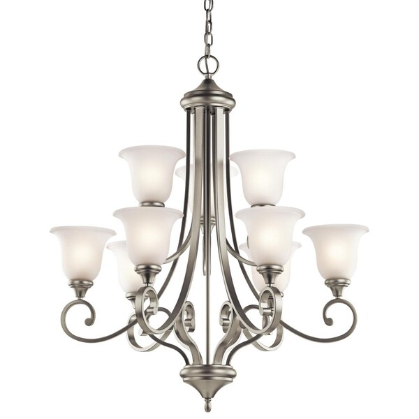 This 9 Light LED Chandelier From The Monroe(Tm) Lighting Collection Is A Unique Twist On Traditional Americana. The Distinctive Metal Base Is Touched With A Brushed Nickel Finish, Which Beautifully Complements The Light Umber Etched Glass Adornment. With This Design, We Have Turned Tradition On Its Head To Create An Updated Look.