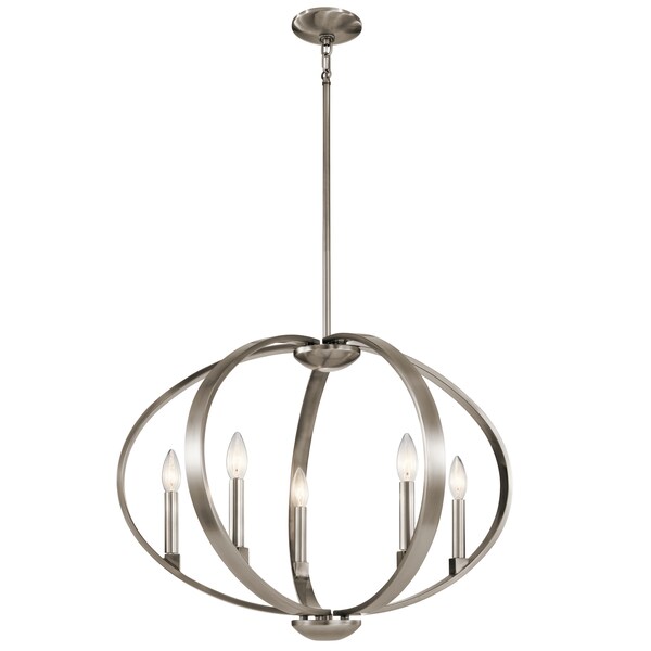 Elata Features An Orbital Look With This 5-Light Chandelier. This Fixture Enhances Any Transitional, Contemporary Or Even Soft Traditional Rooms With The Use Of A Beautiful Classic Pewter Finish With Natural Brass Accents. To Finish Off The Look, Elata Utilizes Candelabra Bulbs Nestled Along The Curves And Atop Cubes.