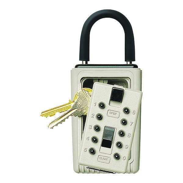 Lock Box, Padlock Mounting Type, Push Button Locking Type, Key Capacity 3, Weather Resistant Yes, Height 5 3/4 in, Width 4 7/16 in, Depth 1 13/16 in, Metal, Beige