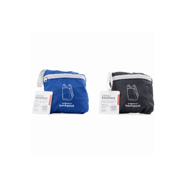 Lightweight compact ripstop backpack. Comes in a compact bag which folds up easy for storage. Great for traveling and back to school. Assorted colors include black or blue. Measures 4.25 in. W x 4.5 in. H x 1.75 in. L.