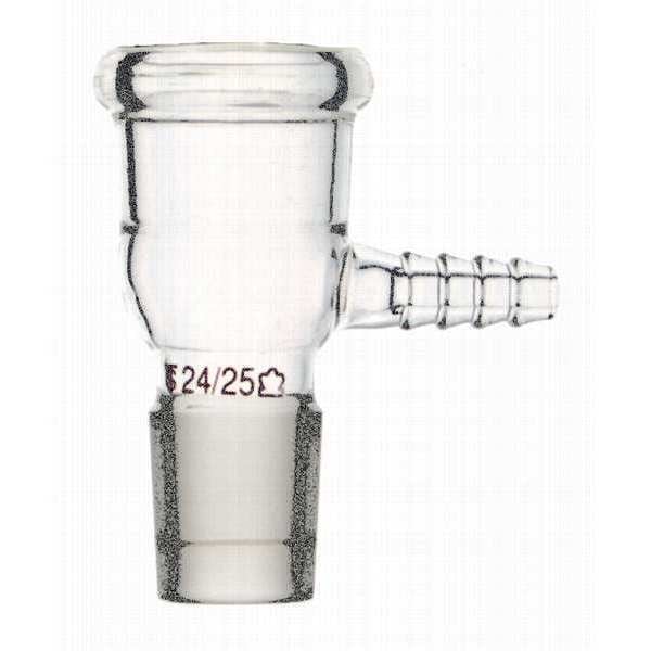 Adapter, Lower Ground Mouth Size 24/25, Upper Ground Mouth Size 24/25, Overall Length 75 mm, USP Specification Type I, Product Type Adapter, Type Adapter, Material Borosilicate Glass, Color Clear, Autoclavable No, Features Funnel and Pluro Stopper Sold Separately, Top Designed for a Pluro Stopper, Standards Not Applicable, Upper Ground Stopper Size 3, ASTM Specification E438