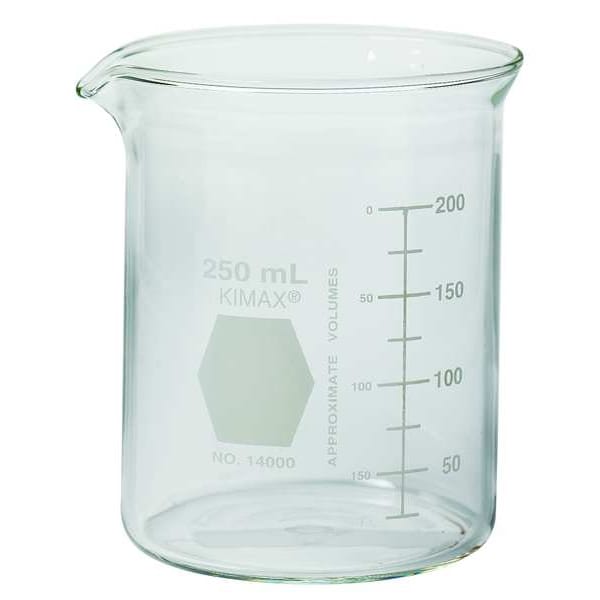 Beaker, Capacity - Metric 250 mL, Capacity - English 8.45 fl oz, Product Type Beaker, Beaker Type Low Form, Outside Diameter - Metric 68 mm, Overall Height - Metric 88 mm, Body Material Borosilicate Glass, Includes Graduations Yes, Glassware Class A, Graduation Increments - Metric 25 mL, Autoclavable Yes, USP Specification Type I, Basic Material Glass, Special Features Suitable for use on a Hotplate, Thick, Slightly Flared, Beaded Top, with a Spout, Disposable/Reusable Reusable