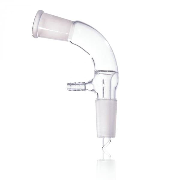 105 Degrees Bent Distillation Adapters with Vacuum Take-Off and Inner Hose Connection, Barbed Hose Connection, Joints are the Same Size, Manufactured from 33 Expansion, Standard Taper Inner Joint with Drip Tip at the Bottom and Standard Taper Outer Joint at the Top