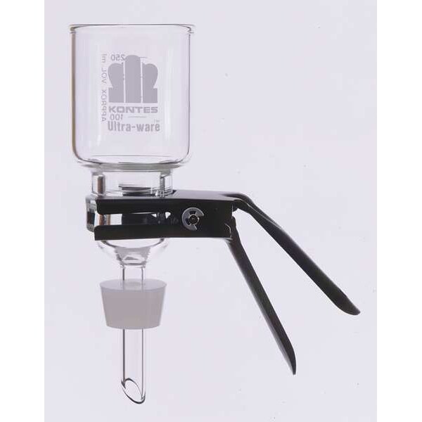 Filtration Support Assembly, Product Type Microfiltration Assembly, Diameter 47 mm, Material Aluminum, Borosilicate Glass, Fritted Glass, Silicone, Includes Stopper Yes, Funnel Capacity 100 mL, Overall Height 229 mm, Maximum Particle Size 60 um, Sterile/Non-Sterile Non-Sterile, Standards ASTM; USP, USP Specification Type I, Autoclavable No, ASTM Specification E438, Graduated Yes