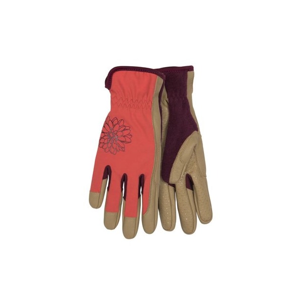 Large Womens Tan Kincopro Mirax2 Synthetic Leather Palm Glove With Reinforced Finger Tips For Added Wear Purple Color Form Fitting Spandex Stretch Back With Floral Silicone Design Padded Knuckle Patch For Added Protection Terry Cloth Sweat Wipe On The Back.