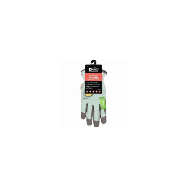 Large, women's aqua synthetic, gray suede gloves. mirax2, suede synthetic leather palm, easy-on cuff with pull-tab & shirred elastic wrist, pieced fabric hem, mirax2 suede synthetic leather reinforcement patch on thumb & fingertips, inset wing thumb design.