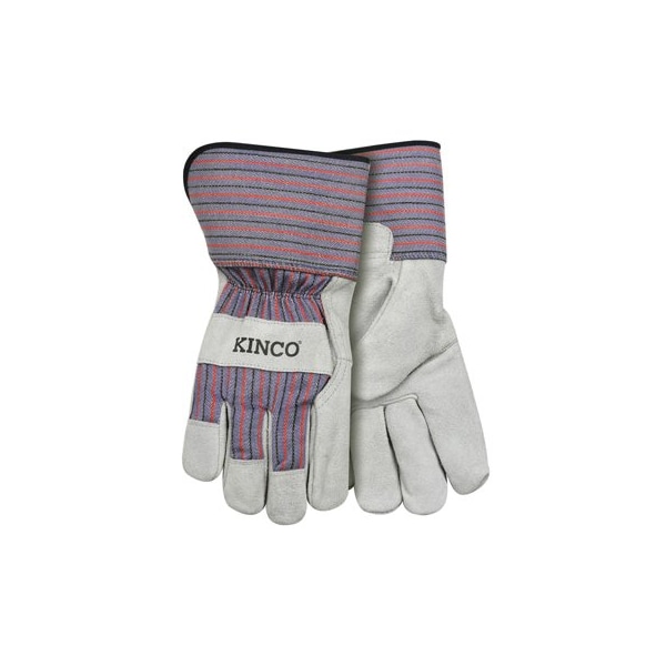 Extra Large Gray Suede Cowhide Palm Glove Striped Cotton Blend Canvas Fabric Back & Cuff Safety Cuff With Shirred Elastic Wrist Fabric Hem Wing Thumb Polyester Cotton Blend Palm Lining.