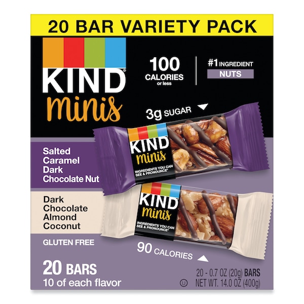 KIND Minis, Salted Caramel and Dark Chocolate Nut/Dark Chocolate Almond and Coconut, 0.7 oz, 20/Pack