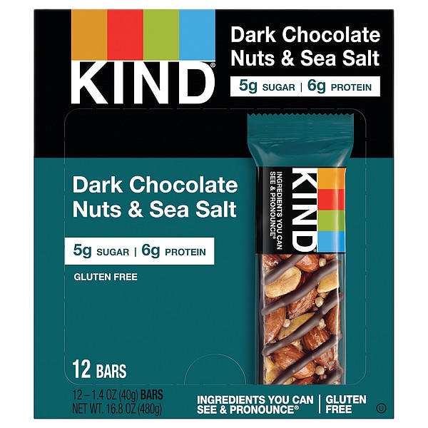 Nut Bars, Packs per Case 1, Product Type Nut Bars, Flavor Almonds, Dark Chocolate, Sea Salt, Items per Pack 12, Pack Size 16.8 oz, Item Height 2 1/2 in, Item Size 1.4 oz, Item Width 6 in, Item Length 6 1/2 in, Package Type Box, Package Quantity 12