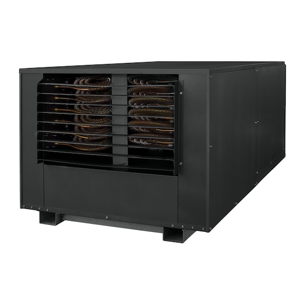 This large kW special application unit heater is approved for use in concealed areas of buildings. It is specifically designed for highrise and office buildings, factories, auto body shops, food processing plants, plating shops and machine shops. This heater may be installed in inaccessible areas such as between a concrete ceiling and a drop tile ceiling, in a open plenum or ducted system. The heater is designed to withstand a dirty, dusty, moist or mildly corrosive environment. Not intended for use where flammable vapors, gases, liquids or other combustibles are, or may be present. High Mass Steel Fin Heat Exchanger. Dual Inlet Blower. Totally Enclosed Motor. N.E.M.A. 12 Construction. Filter Racks. Fixed Louvers Hood. 16GA Steel Enclosure. Element Step Control. 24V Control. Can Be Ducted.