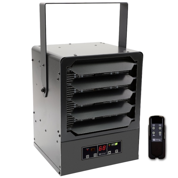The KBP ECO2S series compact unit heater delivers exceptional performance, energy efficiency, and user control, featuring King’s innovative built-in ECO2S electronic thermostat with remote control. The heaters provide energy-efficient 2-stage heating, an Eco mode that automatically uses the lowest wattage needed, integrated fan-only and timer modes, and a convenient remote for simple operation. Built for rugged performance, the flow-through design efficiently draws air in from the back and discharges it out the front, quickly heating large spaces. An integral fan delay continues to circulate heat during cool down, maximizing warmth. King’s exclusive dual Pic-A-Watt steel fin elements provide a range of wattage options, letting you tailor the heater to the specific requirements of any area.