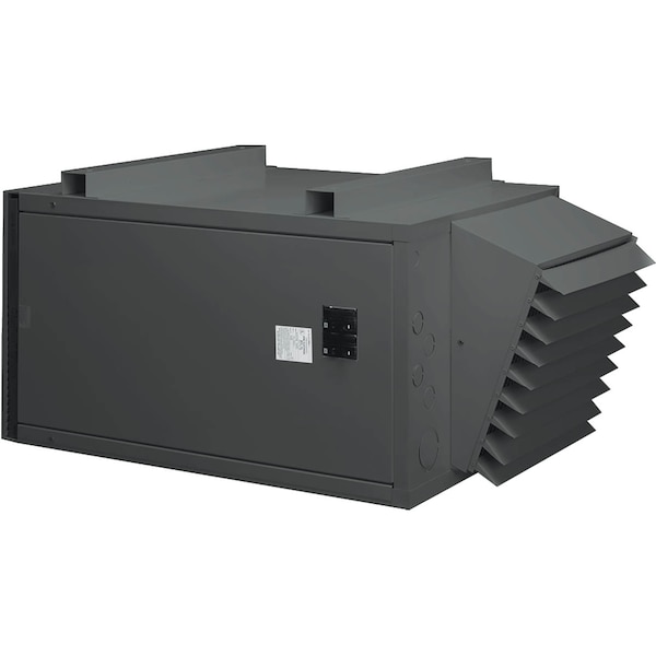The KFUH series high air velocity unit heater is an efficient, dependable unit heater perfectly suited for high ceiling applications such as warehouses, parking garages and docks. The 3-speed, high-capacity motor and blower quietly delivers large volumes of air ranging from 775 to 1540 CFM minimum. With welded mounting channels on the unit, the heater may be mounted at any angle. Safety screens are provided at both the air intake and discharge aperture. The intake filter is replaceable. Thermostat may be ordered separately. Heavy Duty Open Coil Element. Direct Drive Air Over Type Motor. Dual Inlet Industrial Blower. Horizontal or Vertical Mount. Quiet Switching Relays. Replaceable Intake Filter. Ductable on Intake & Outlet. 24 Volt Control. ECM Motor (optional).