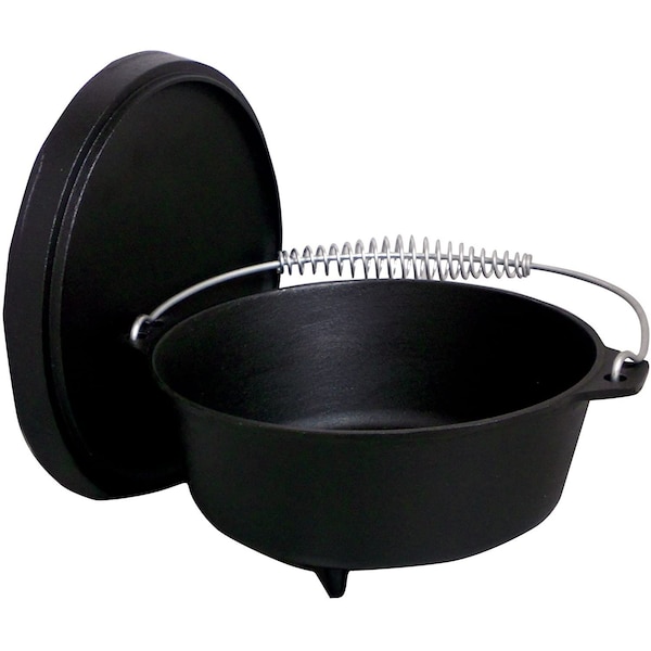 Great for use at the campsite! King Kooker 4 quart cast iron dutch oven with feet and coal lid. Cast iron construction allows for even heat distribution, eliminating cold spots. Wonderful for soups, stews, chili, jambalaya and gumbo! Excellent for roasting and frying! Pre-seasoned and ready to cook!