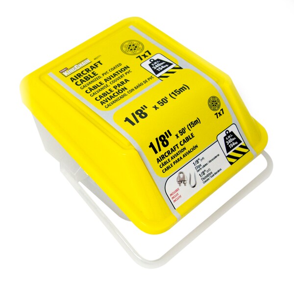 KingChain vinyl-coated galvanized aircraft cables are used for many material handling applications and have typical home uses for garage door cables, winch lines, tie-downs, dog runs, hanging signs, and guy wires for flagpoles. KingChain aircraft cable is made in accordance with US Federal Specification RR-W-410D. The cable is hot-dipped galvanized for long lasting durability and moderate corrosion resistance. The 7x7 construction consists of 7 individual wires laid in a spiral around a center "King" wire to form a strand. Seven strands are then wound together to form a cable. The cable is then coated in a clear sheath of vinyl for added weather resistance. This construction provides good strength, good flexibility and good abrasion resistance. Remove sections of the vinyl coating when using cable accessories, like sleeves, clips or thimbles. The steel cable must be in contact with the accessory to ensure a secure grip. This cable has a Safe Working Load (SWL) of 340 lbs (154 kg). Its breaking strength is 5 times the SWL (design factor 5:1). Any breaking strength ratings are listed for comparison purposes only. Actual operating loads may vary but should not exceed the recommended design factor of 20% of the products breaking strength. Not intended for aircraft use.