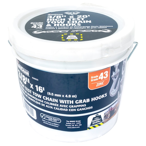 KingChain Grade 43 tow chains are ideal for pulling, binding, securing, and towing all types of loads. The tow chain has forged Grade 43 clevis grab hooks at both ends. Used to tie down or “bind” loads for transportation and can be used with chain blocks or winch pullers. May be used in accordance with the latest D.O.T. regulations. Both the chain and hooks are stamped with G43, for identification and to ensure compliance with DOT standards. Chain and hooks are zinc plated for a bright, visible finish with moderate corrosion resistance. The chain features our standard G43 short link chain, which fatigue less, last longer and provide more hooking points for your binders and hooks (compared to long-link chain). This chain complies with the D.O.T. standards for all major transportation fleets in the United States and Canada. Never exceed the 5,400 lbs (2,455 kg) Safe Work Load. Not for overhead lifting.