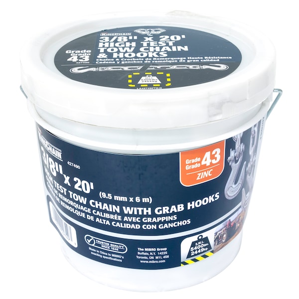 KingChain Grade 43 tow chains are ideal for pulling, binding, securing, and towing all types of loads. The tow chain has forged Grade 43 clevis grab hooks at both ends. Used to tie down or “bind” loads for transportation and can be used with chain blocks or winch pullers. May be used in accordance with the latest D.O.T. regulations. Both the chain and hooks are stamped with G43, for identification and to ensure compliance with DOT standards. Chain and hooks are zinc plated for a bright, visible finish with moderate corrosion resistance. The chain features our standard G43 short link chain, which fatigue less, last longer and provide more hooking points for your binders and hooks (compared to long-link chain). This chain complies with the D.O.T. standards for all major transportation fleets in the United States and Canada. Never exceed the 5,400 lbs (2,455 kg) Safe Work Load. Not for overhead lifting.