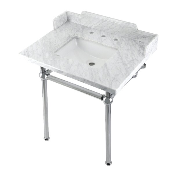 With a beautiful carrara marble counter top, this console sink set with back and side splashes is a long lasting, durable, and elegant addition to your bathroom A fabulous alternative where space is limited or tight making them friendly for the whole family With different shades and natural designs, otherwise known as veining, no two sinks will be alike Also for your convenience, antislip rubber pads are included with the brass legs to ensure steadiness Water supply kit, drain assembly, and the faucet are sold separately Kingston's carrara marble tops are polished, but they are not sealed Polished marble has a shiny surface and resists stains Natural stone, even when polished, is still somewhat porous and does remain susceptible to etching by acidic compounds like fruit juice, vinegar, some cleaning solvents, etc For customers that wish to further protect their investment the marble can be sealed The following is intended solely for informational purposes For anyone unfamiliar with this nature of project, Kingston recommends consulting an experienced professional in your area When looking for a sealant product, please be sure to seek a product specifically designed for use on polished marble, granite or other natural stone surfaces Be sure to always avoid anything containing a citrus ingredient, acid ingredient, tung oil, linseed oil, or other natural oils These can damage or discolor your marble