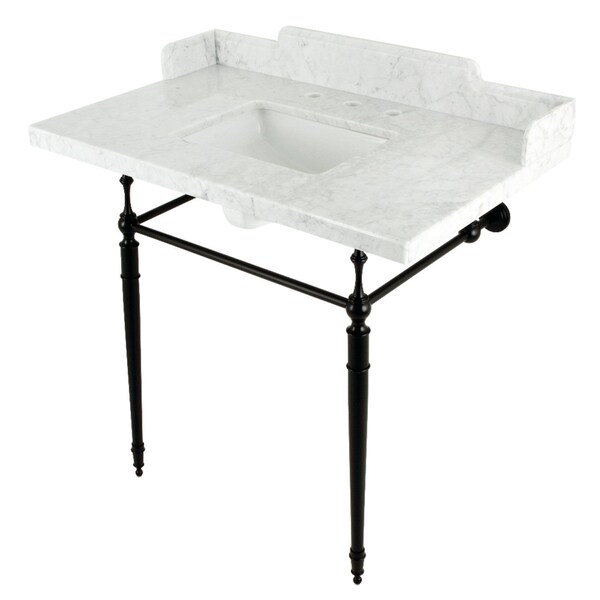 With a beautiful carrara marble counter top, this 36 x 22 console sink set with back and side splashes is a long lasting, durable, and elegant addition to your bathroom A fabulous alternative where space is limited or tight making them friendly for the whole family With different shades and natural designs, otherwise known as veining, no two sinks will be alike Also for your convenience, antislip rubber pads are included with the brass legs to ensure steadiness Water supply kit, drain assembly, and the faucet are sold separately Kingston's carrara marble tops are polished, but they are not sealed Polished marble has a shiny surface and resists stains Natural stone, even when polished, is still somewhat porous and does remain susceptible to etching by acidic compounds like fruit juice, vinegar, some cleaning solvents, etc For customers that wish to further protect their investment the marble can be sealed The following is intended solely for informational purposes For anyone unfamiliar with this nature of project, Kingston recommends consulting an experienced professional in your area When looking for a sealant product, please be sure to seek a product specifically designed for use on polished marble, granite or other natural stone surfaces Be sure to always avoid anything containing a citrus ingredient, acid ingredient, tung oil, linseed oil, or other natural oils These can damage or discolor your marble