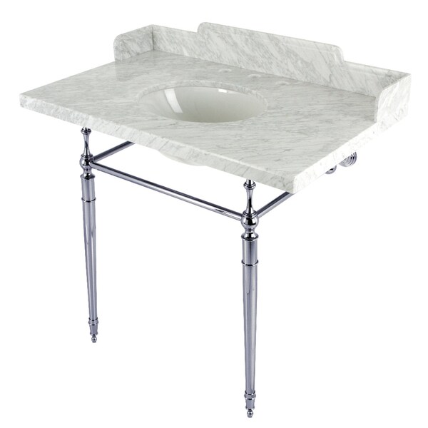 With a beautiful carrara marble counter top, this 36 x 22 console sink set with back and side splashes is a long lasting, durable, and elegant addition to your bathroom A fabulous alternative where space is limited or tight making them friendly for the whole family With different shades and natural designs, otherwise known as veining, no two sinks will be alike Also for your convenience, antislip rubber pads are included with the brass legs to ensure steadiness Water supply kit, drain assembly, and the faucet are sold separately Kingston's carrara marble tops are polished, but they are not sealed Polished marble has a shiny surface and resists stains Natural stone, even when polished, is still somewhat porous and does remain susceptible to etching by acidic compounds like fruit juice, vinegar, some cleaning solvents, etc For customers that wish to further protect their investment the marble can be sealed The following is intended solely for informational purposes For anyone unfamiliar with this nature of project, Kingston recommends consulting an experienced professional in your area When looking for a sealant product, please be sure to seek a product specifically designed for use on polished marble, granite or other natural stone surfaces Be sure to always avoid anything containing a citrus ingredient, acid ingredient, tung oil, linseed oil, or other natural oils These can damage or discolor your marble