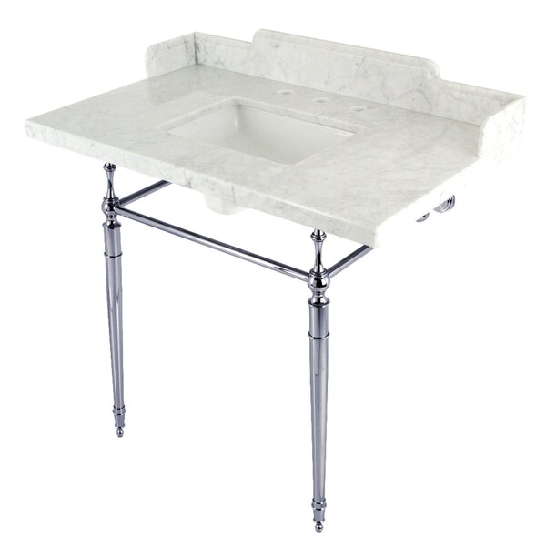 With a beautiful carrara marble counter top, this 36 x 22 console sink set with back and side splashes is a long lasting, durable, and elegant addition to your bathroom A fabulous alternative where space is limited or tight making them friendly for the whole family With different shades and natural designs, otherwise known as veining, no two sinks will be alike Also for your convenience, antislip rubber pads are included with the brass legs to ensure steadiness Water supply kit, drain assembly, and the faucet are sold separately Kingston's carrara marble tops are polished, but they are not sealed Polished marble has a shiny surface and resists stains Natural stone, even when polished, is still somewhat porous and does remain susceptible to etching by acidic compounds like fruit juice, vinegar, some cleaning solvents, etc For customers that wish to further protect their investment the marble can be sealed The following is intended solely for informational purposes For anyone unfamiliar with this nature of project, Kingston recommends consulting an experienced professional in your area When looking for a sealant product, please be sure to seek a product specifically designed for use on polished marble, granite or other natural stone surfaces Be sure to always avoid anything containing a citrus ingredient, acid ingredient, tung oil, linseed oil, or other natural oils These can damage or discolor your marble