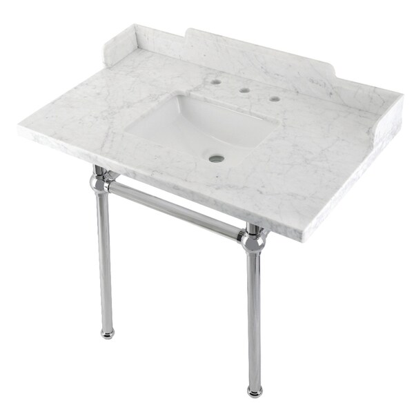 With a beautiful carrara marble counter top, this console sink set is a long lasting, durable, and elegant addition to your bathroom A fabulous alternative where space is limited or tight making them friendly for the whole family With different shades and natural designs, otherwise known as veining, no two sinks will be alike Also for your convenience, antislip rubber pads are included with the brass legs to ensure steadiness Water supply kit, drain assembly, and the faucet are sold separately Kingston's carrara marble tops are polished, but they are not sealed Polished marble has a shiny surface and resists stains Natural stone, even when polished, is still somewhat porous and does remain susceptible to etching by acidic compounds like fruit juice, vinegar, some cleaning solvents, etc For customers that wish to further protect their investment the marble can be sealed The following is intended solely for informational purposes For anyone unfamiliar with this nature of project, Kingston recommends consulting an experienced professional in your area When looking for a sealant product, please be sure to seek a product specifically designed for use on polished marble, granite or other natural stone surfaces Be sure to always avoid anything containing a citrus ingredient, acid ingredient, tung oil, linseed oil, or other natural oils These can damage or discolor your marble
