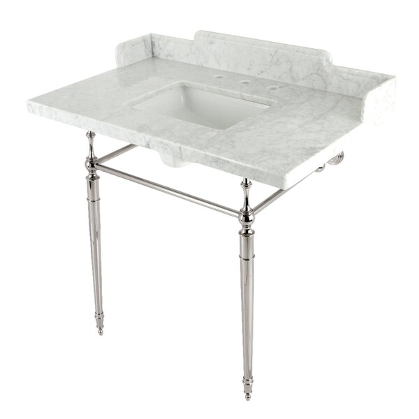 With a beautiful carrara marble counter top, this 36 x 22 console sink set with back and side splashes is a long lasting, durable, and elegant addition to your bathroom A fabulous alternative where space is limited or tight making them friendly for the whole family With different shades and natural designs, otherwise known as veining, no two sinks will be alike Also for your convenience, antislip rubber pads are included with the brass legs to ensure steadiness Water supply kit, drain assembly, and the faucet are sold separately Kingston's carrara marble tops are polished, but they are not sealed Polished marble has a shiny surface and resists stains Natural stone, even when polished, is still somewhat porous and does remain susceptible to etching by acidic compounds like fruit juice, vinegar, some cleaning solvents, etc For customers that wish to further protect their investment the marble can be sealed The following is intended solely for informational purposes For anyone unfamiliar with this nature of project, Kingston recommends consulting an experienced professional in your area When looking for a sealant product, please be sure to seek a product specifically designed for use on polished marble, granite or other natural stone surfaces Be sure to always avoid anything containing a citrus ingredient, acid ingredient, tung oil, linseed oil, or other natural oils These can damage or discolor your marble