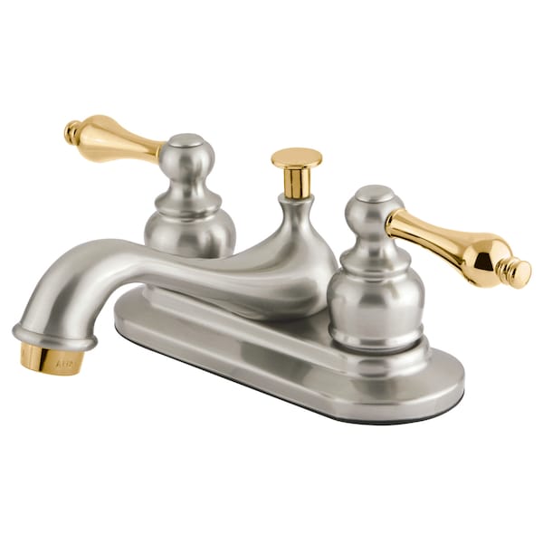 Classical artistry from the late 19th Century to early 20th Century is mirrored beautifully within this faucet's traditional charm. Centerset bathroom faucets are ideal for smaller bathrooms and feature an easy 3-hole installation. The Restoration 4-inch centerset bathroom faucet with retail pop-up and its sturdy brass construction and premium brushed nickel/polished brass finish are guaranteed to glamorize your home. A matching finish drain is also included.